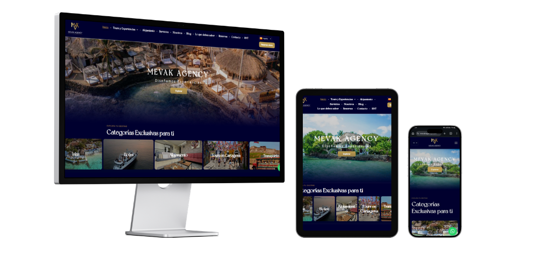 Mevak Agency cuenta con una página web moderna y funcional, diseñada para una agencia de viajes, que facilita la visualización de destinos, tours y servicios, optimizada para SEO y enfocada en convertir visitantes en clientes a través de una experiencia clara, rápida y atractiva.